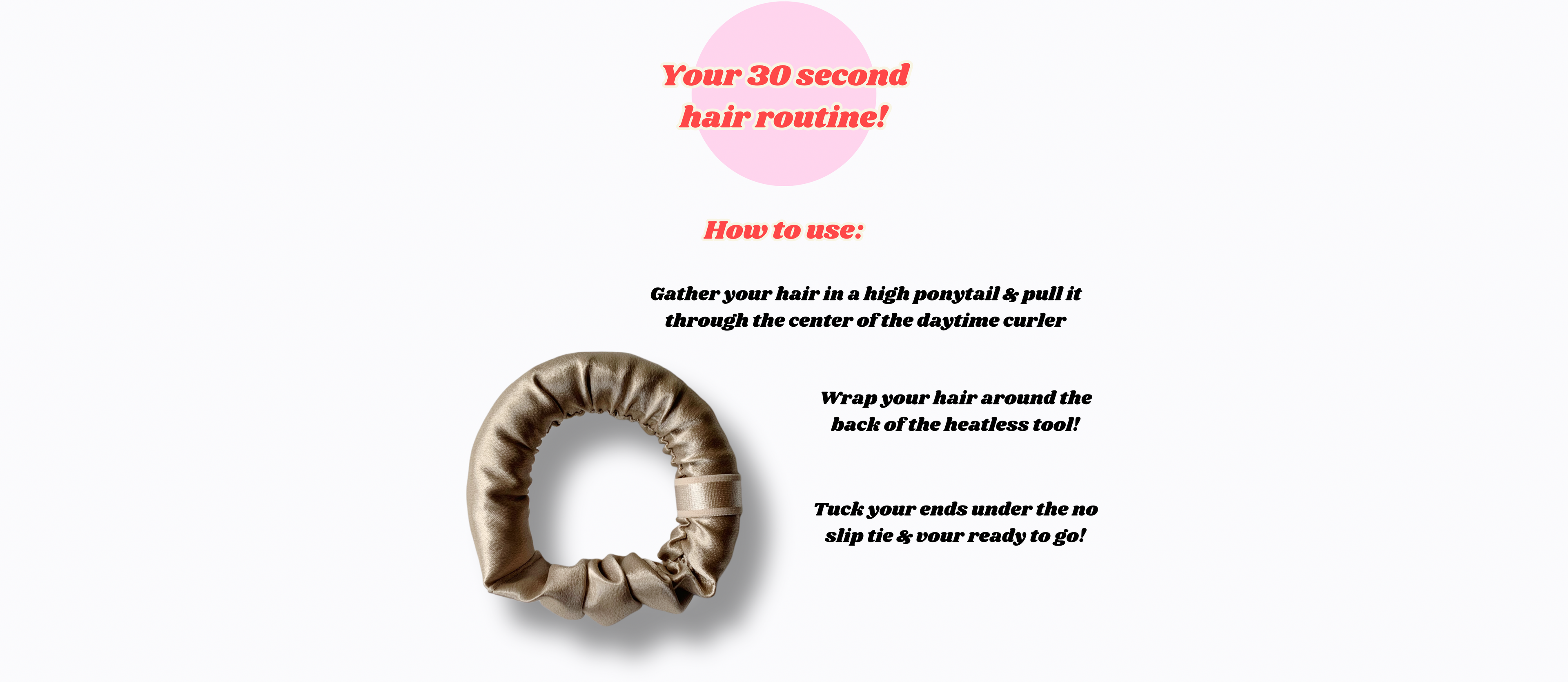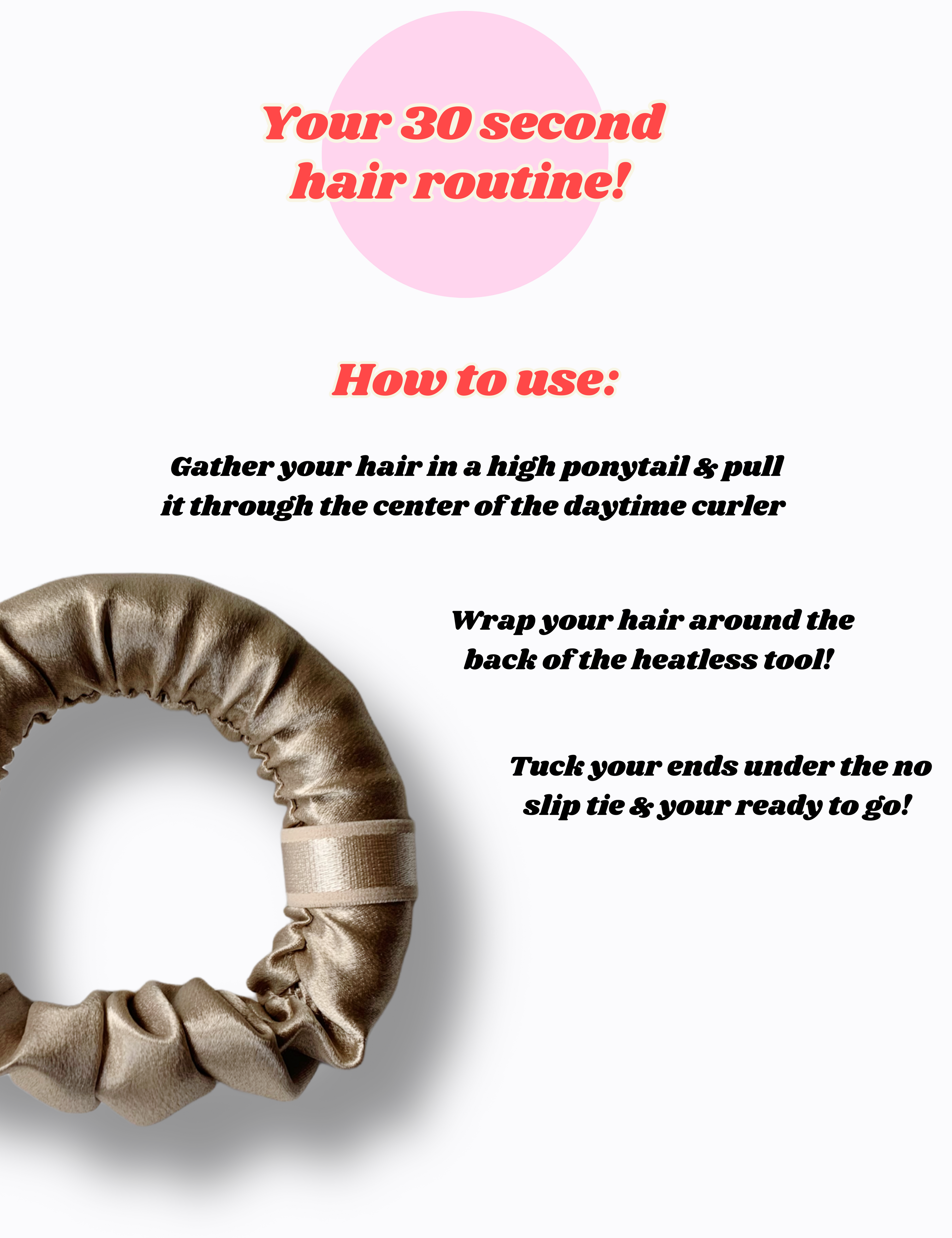 Gather your hair in a high ponytail & pull it through the center of the daytime curler. Wrap your hair around the body of the heatless tool! Tuck your ends under the no slip tie & you’re ready to go!